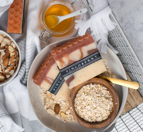 Ingredients: Purified water, saponified oils of organic olive, organic coconut, palm, shea butter, select essential and/or fragrance oil, rolled oats, mica.